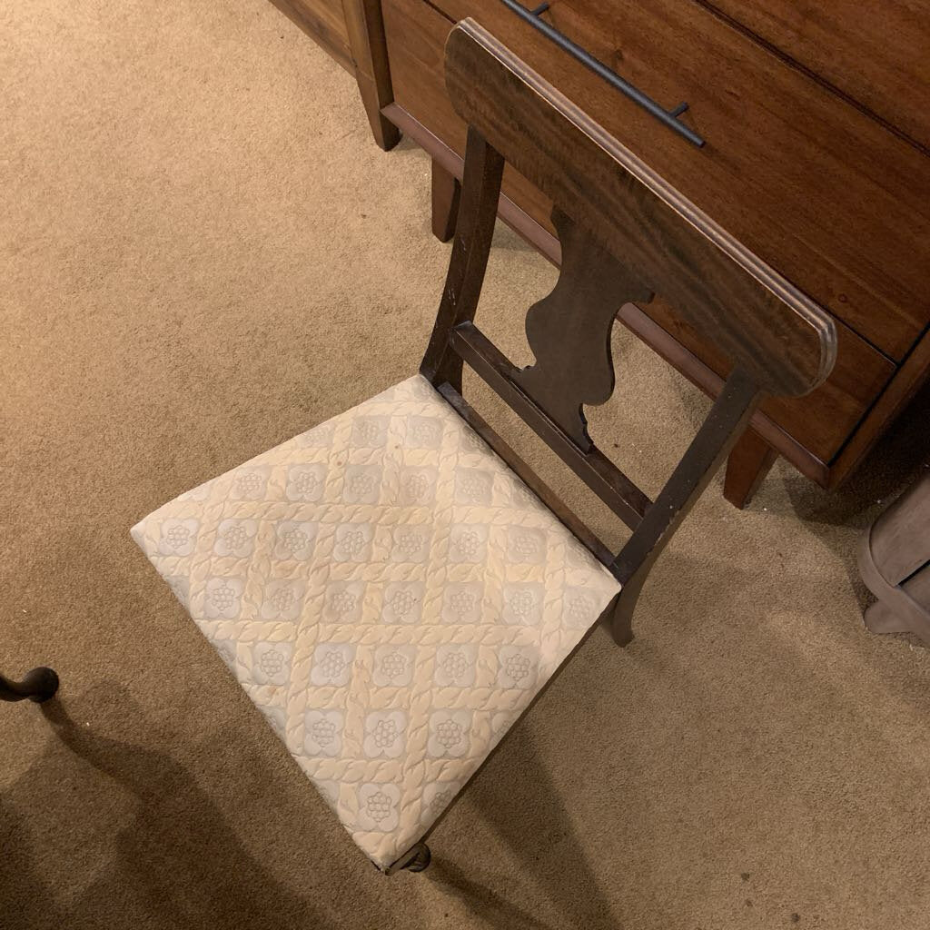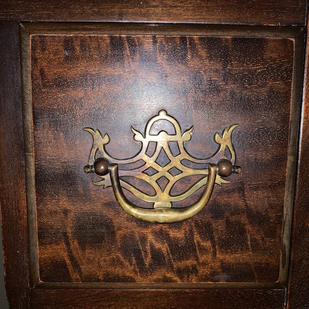The 1920's Vanity Desk w/ Glass Top and Chair is a masterwork of early 20th-century craftsmanship and classical elegance. This set features a rich, dark-toned wood finish with a prominent natural grain, accented by ornate antique brass batwing pulls. The desk is designed with a protective glass top surface and a versatile five-drawer configuration, including deep side cabinets and a wide central drawer. Elevated on graceful cabriole legs, the vanity is paired with a matching side chair featuring a neutral upholstered seat. This sophisticated set serves as a timeless anchor for a traditional primary suite or a curated vintage dressing room.