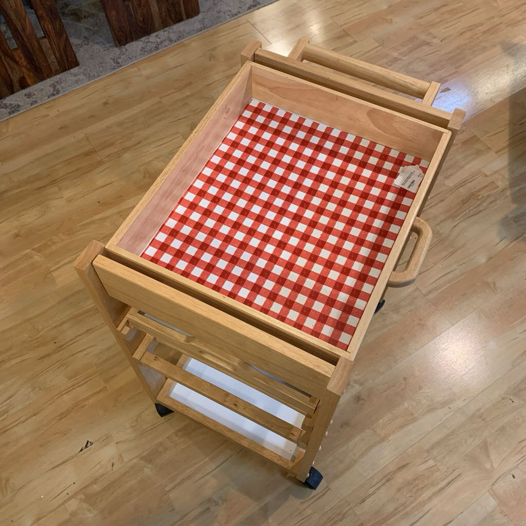 This Blond Wood Rolling Cart combines rustic charm with practical utility, featuring a playful red and white checkerboard pattern on the top surface. The light wood frame includes tiered shelving, a pull-out drawer, and integrated wine bottle storage, making it a highly versatile mobile station for your kitchen or dining area.