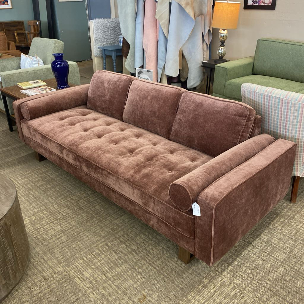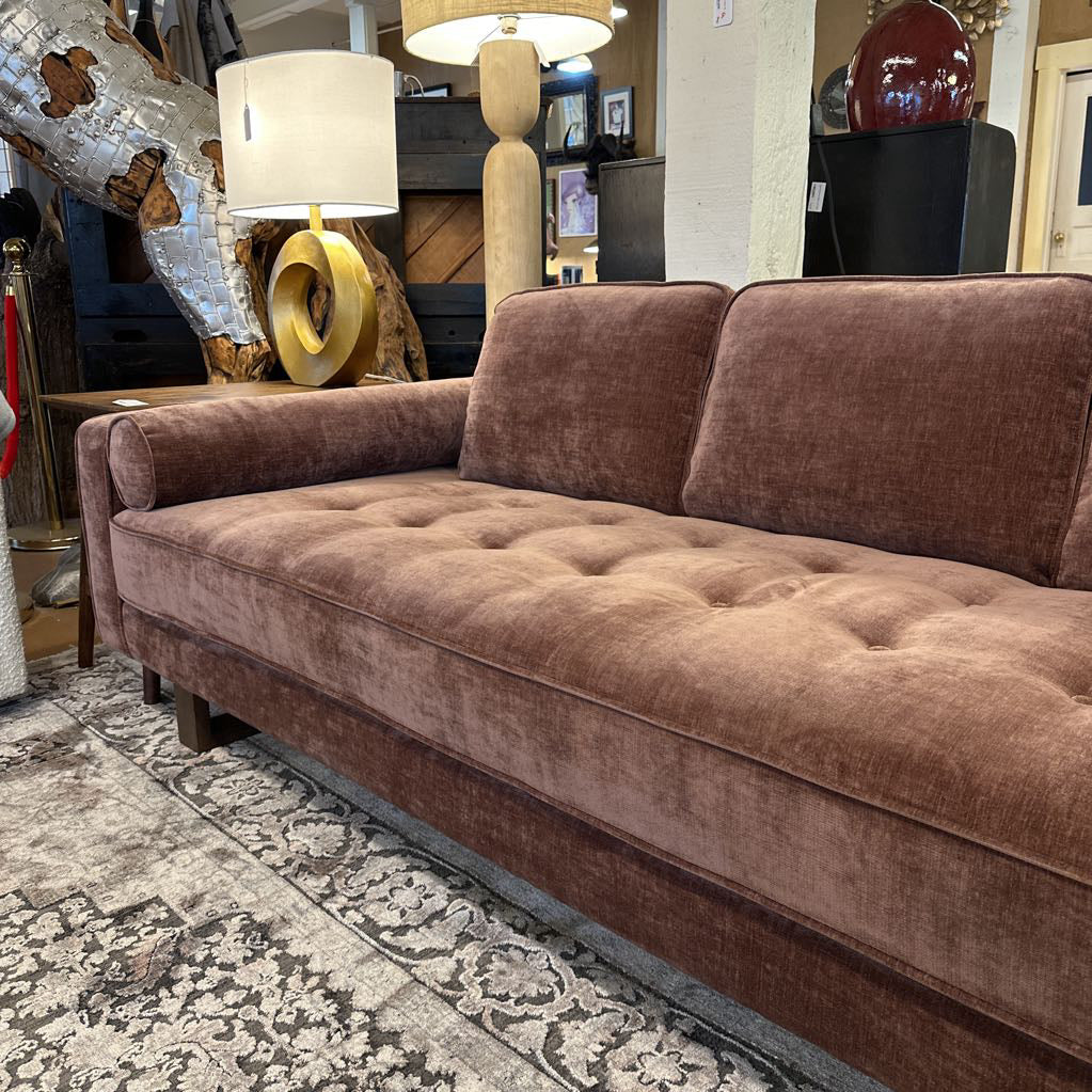 Add a touch of vintage-inspired luxury to your living room with the Branson Currant Sofa, a perfect blend of mid-century charm and modern comfort. Upholstered in a rich, velvety fabric in a deep currant hue, this sofa features a sophisticated tufted seat and plush back cushions for an inviting lounging experience. The clean-lined silhouette is elegantly accented by matching bolster pillows and sits atop sturdy, squared legs in a walnut finish that provide a solid, grounded aesthetic. Whether you're hosting a formal gathering or curling up for a movie night, the Branson Sofa offers a spacious, high-style retreat that anchors any interior with warmth and texture.