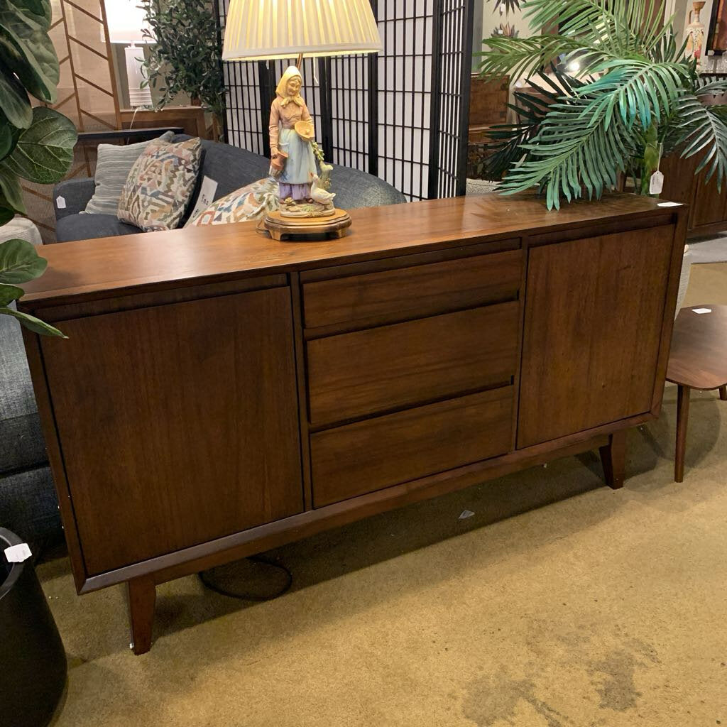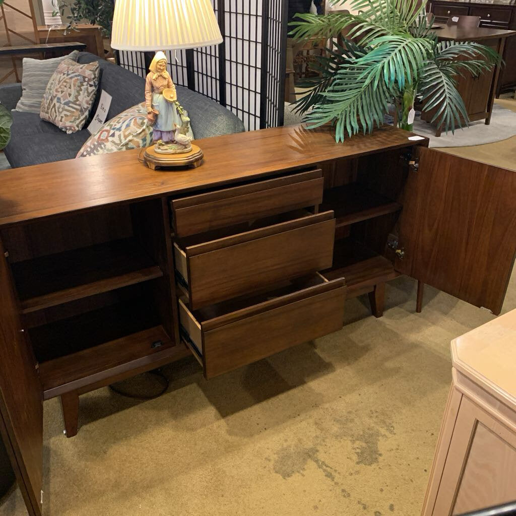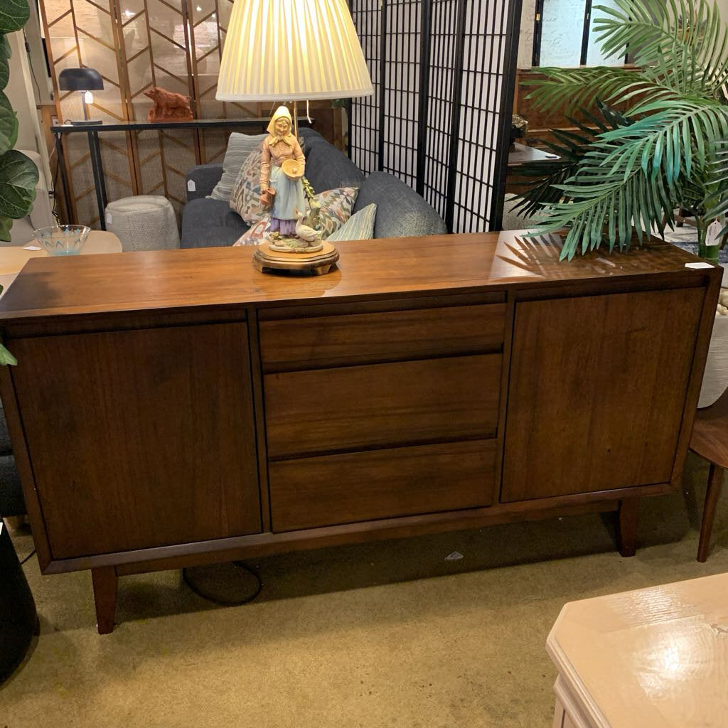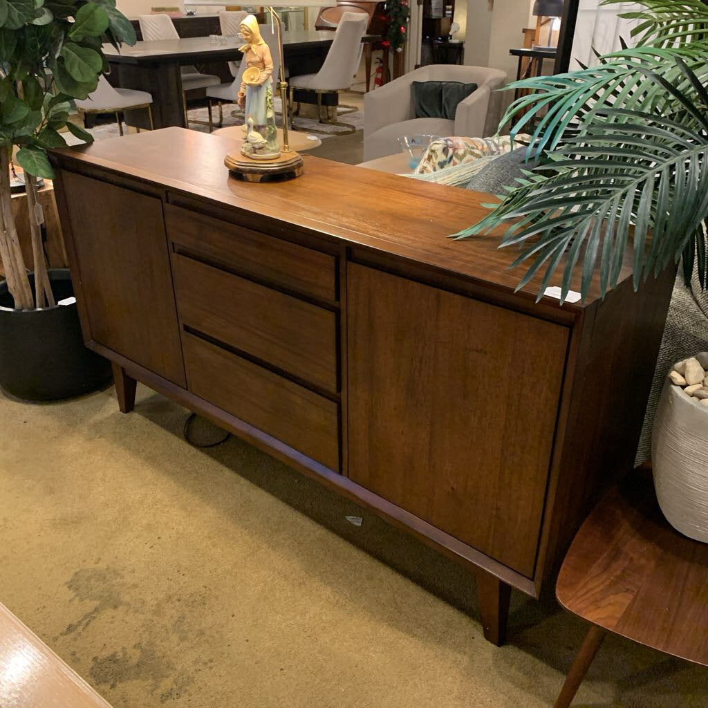 This mid-century inspired sideboard offers a balance of style and storage, with two cabinet doors and three central drawers set in a rich walnut finish. Elevated on tapered legs, it’s a versatile piece that works beautifully in dining rooms, living spaces, or entryways while keeping essentials neatly organized.