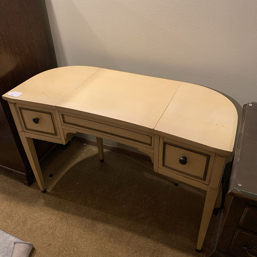 The Butter Yellow Lift Top Vanity is a clever and space-saving piece of functional furniture. Finished in a cheerful, creamy butter yellow lacquer, this vanity features a clean-lined traditional silhouette with a unique multi-functional top. The central surface lifts to reveal a hidden mirror and an internal storage compartment, while two side drawers provide additional space for cosmetics and jewelry. With its sunny palette and concealed utility, this vanity serves as a perfect anchor for a compact bedroom, a dressing area, or a charming guest suite.