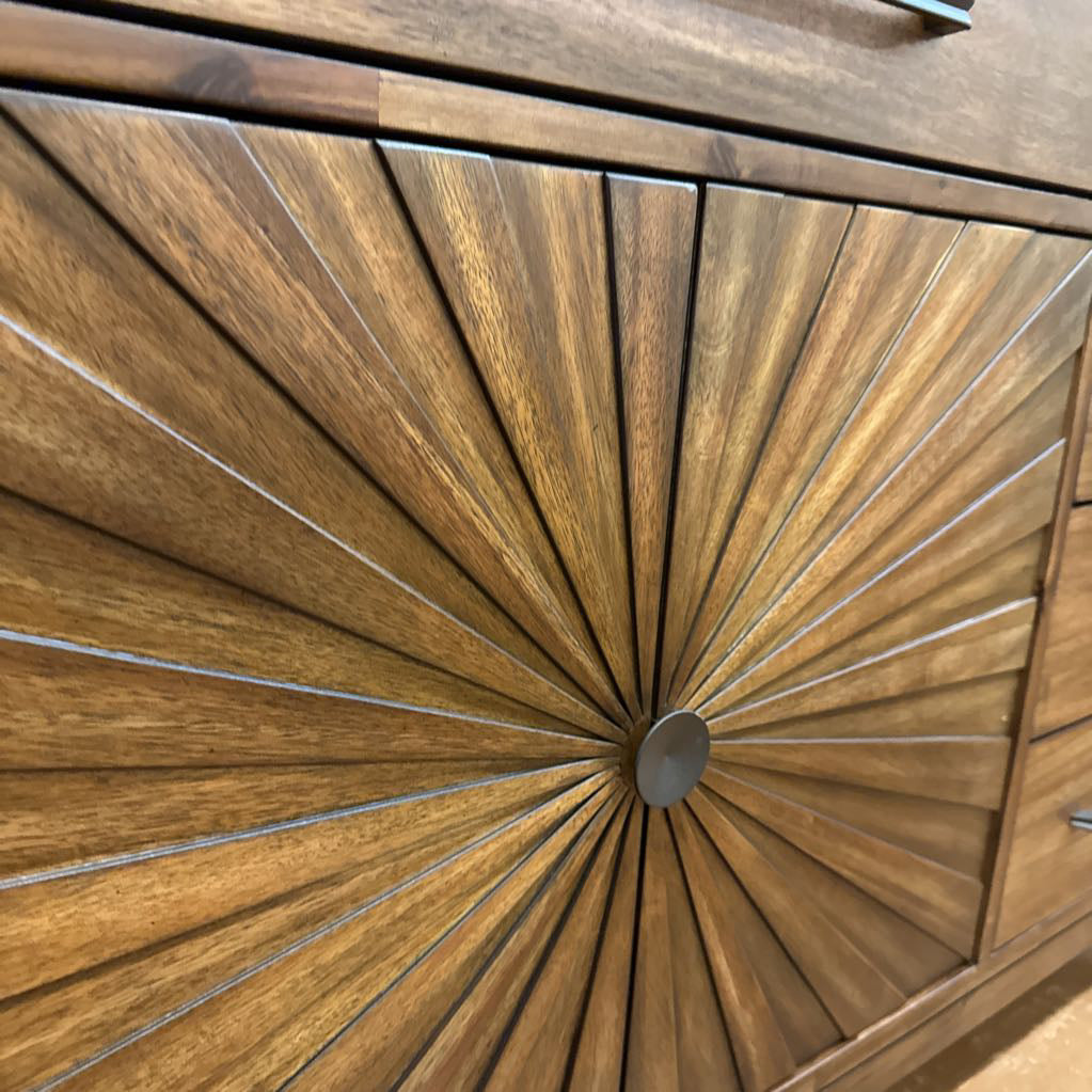 A stylish wooden server featuring a warm natural finish, clean lines, and a striking sunburst pattern on the cabinet fronts. With multiple drawers and spacious storage, it brings both function and visual interest to dining rooms, living spaces, or entertaining areas.