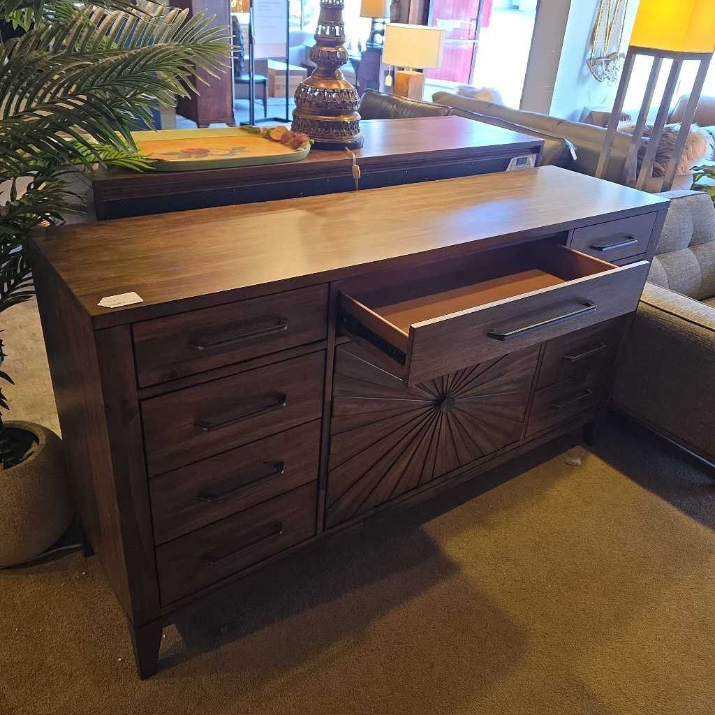 A stylish wooden server featuring a warm natural finish, clean lines, and a striking sunburst pattern on the cabinet fronts. With multiple drawers and spacious storage, it brings both function and visual interest to dining rooms, living spaces, or entertaining areas.