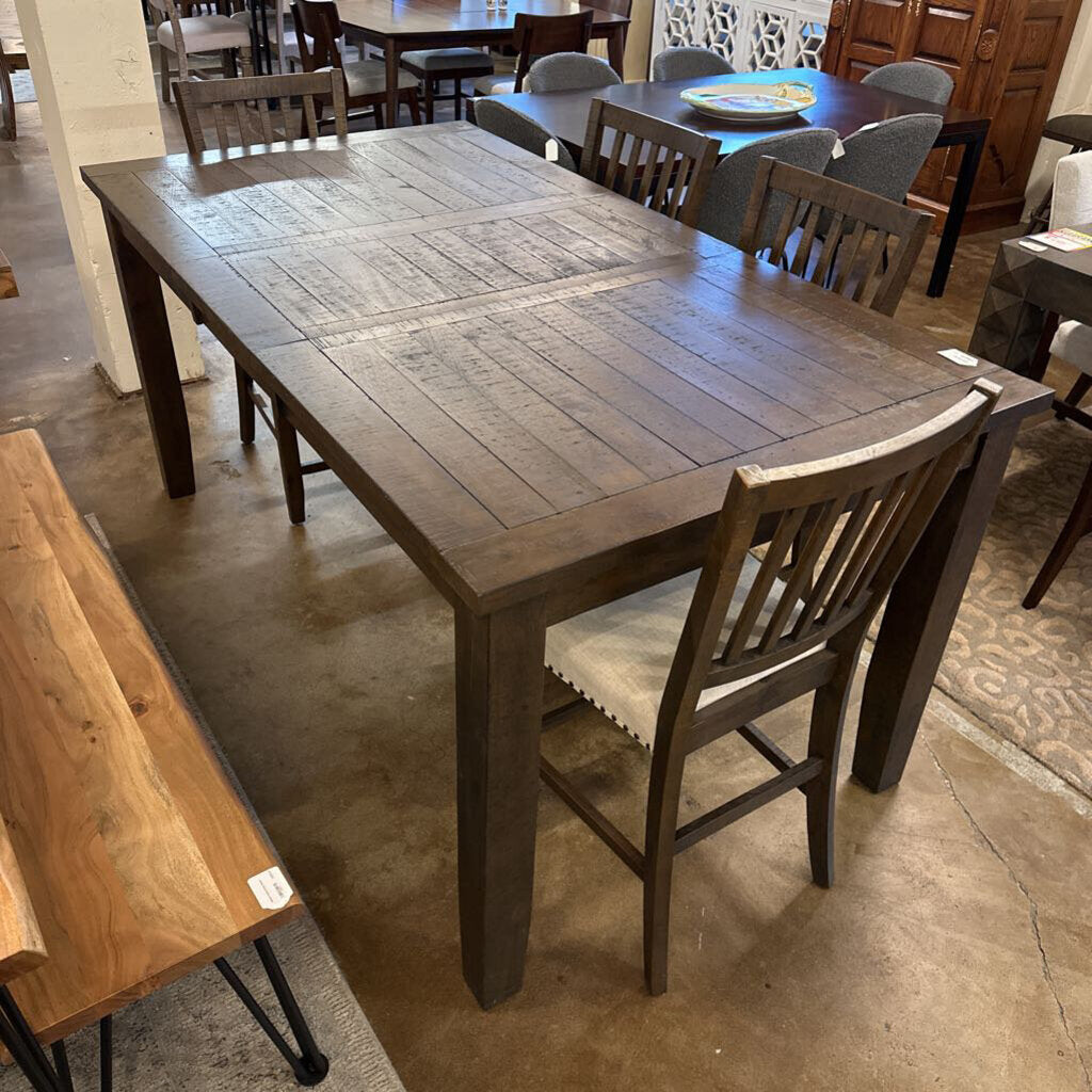 This rustic-style counter-height dining table offers both versatility and character, making it well suited for everyday dining or casual entertaining. Crafted with a warm, timeworn finish, the table features clean, sturdy lines that highlight its approachable, farmhouse-inspired design. The expandable top allows the table to adapt easily to larger gatherings.The table includes a removable 17.75-inch-wide leaf; the listed length reflects the table with the leaf installed. Also included are four matching counter-height chairs, designed to complement the table’s rustic aesthetic and provide comfortable, cohesive seating.