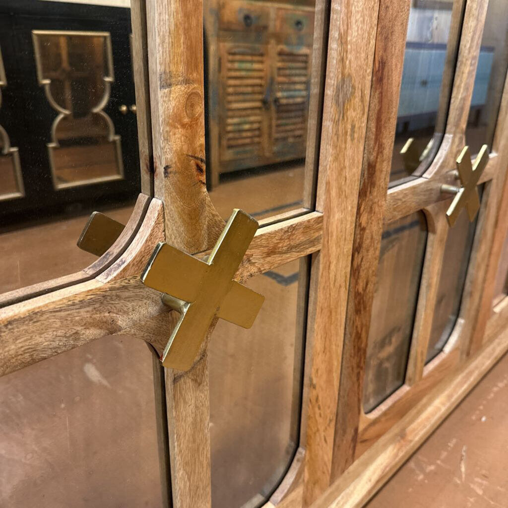 The Esterson 4 Door Sideboard features a wooden design with mirrored doors that add depth and light to any room. Its elegant gold X-shaped hardware provides a stylish accent while offering easy access to spacious interior storage. This sideboard combines functionality with a clean, simple look, making it a versatile addition to your living or dining space.