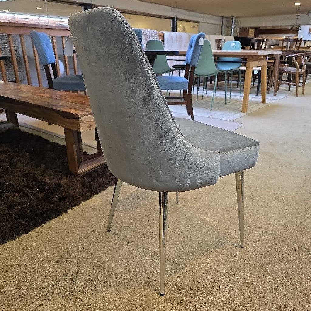 A sleek and contemporary dining chair that blends soft upholstery with gleaming chrome legs for a modern edge. The curved back and plush seat bring comfort to every meal, while the neutral tone makes it easy to pair with a variety of dining tables and décor styles. Perfect for creating a chic, inviting dining space that feels both stylish and cozy.