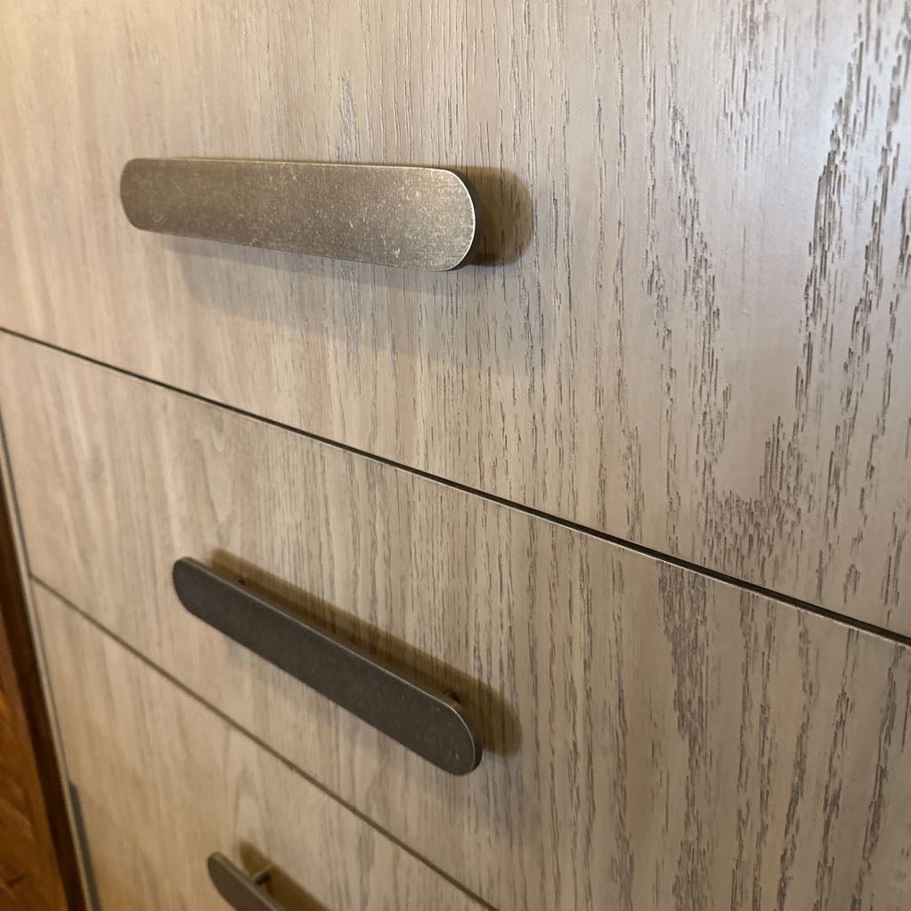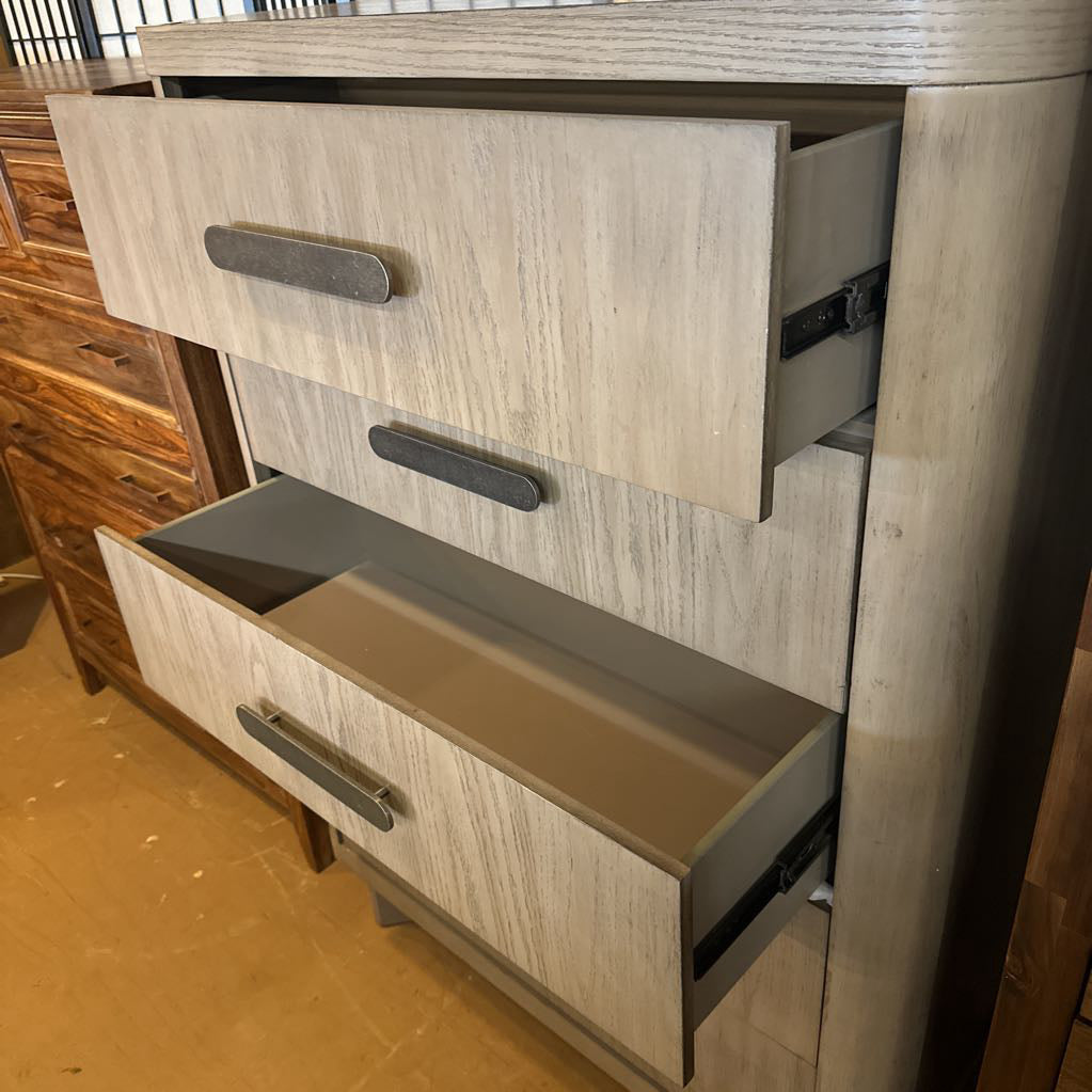 The Magnum Chest is a masterwork of contemporary texture and architectural softness. This substantial highboy features a light, weathered oak finish that showcases a delicate, linear wood grain. The piece is defined by its elegant rounded-corner silhouette, creating a fluid, continuous frame around five expansive drawers. Each drawer is accented with a wide, textured metallic pull handle in a contrasting bronze tone, providing a sophisticated industrial touch to the organic palette. With its generous vertical storage and refined detailing, the Magnum Chest serves as a serene and stylish anchor for a modern primary suite, a transitional guest room, or a curated urban interior.