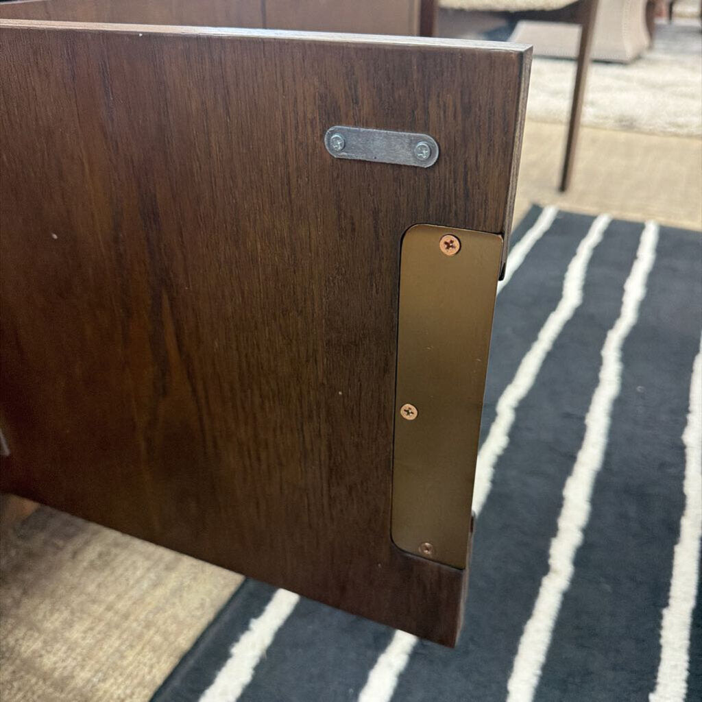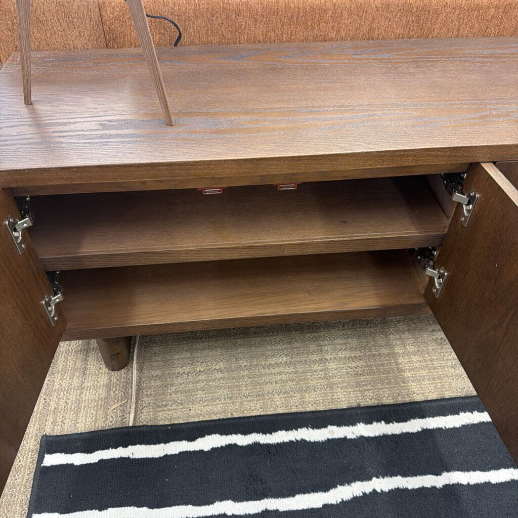 Sleek, sturdy, and stylish — the Molinos Media Unit is a modern essential for your living room setup. Crafted from rich, dark-stained wood, this piece features clean lines, smooth edges, and a low-profile design that makes it both timeless and versatile. Behind the slatted cabinet doors, you’ll find generous storage space with adjustable shelving, perfect for organizing electronics, books, or decor. Its minimalist design and quality craftsmanship make it an ideal fit for both contemporary and mid-century spaces.