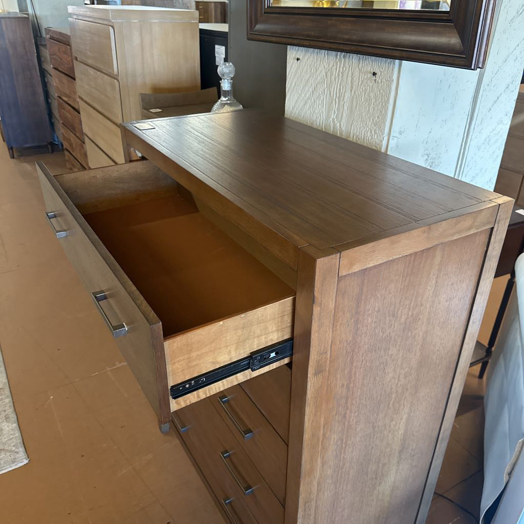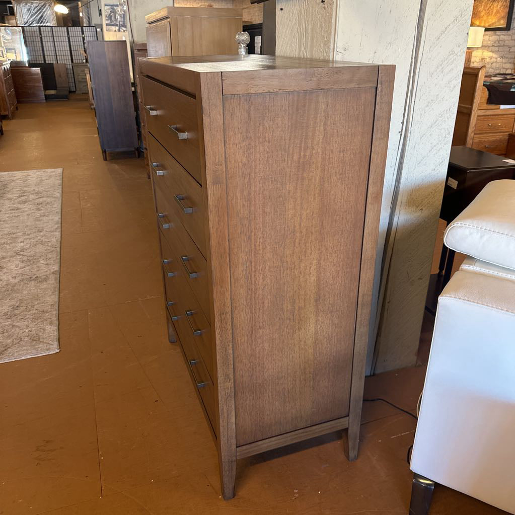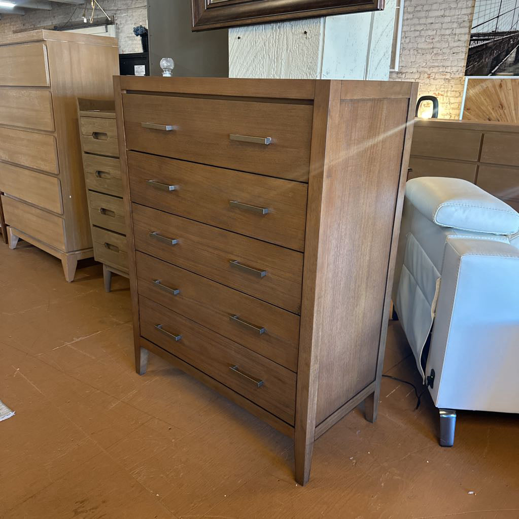 A contemporary chest with a warm wood finish and sleek metal pulls. The Niko design offers generous drawer storage with a modern, streamlined look that fits easily into any bedroom style.