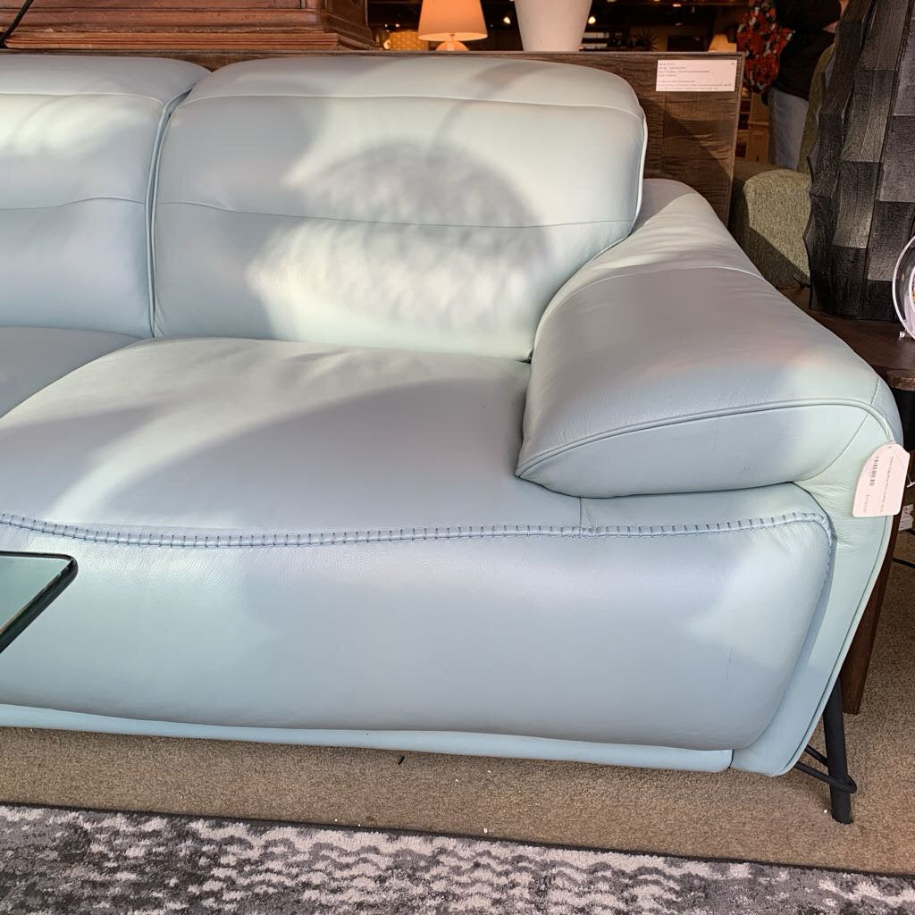 The Robin Egg Blue Mod Leather Sofa is a captivating fusion of retro-futuristic form and serene, high-end color. Upholstered in premium top-grain leather in a refreshing "Robin Egg" blue, this sofa features a sleek, low-profile silhouette defined by its unique architectural channel-stitched backrest. The design is characterized by its broad, comfortable seat cushions and integrated, overstuffed armrests that transition seamlessly into the frame. Elevated by minimalist black stiletto-style metal legs, this sofa serves as a bold, sophisticated centerpiece for a mid-century modern living space or a bright, contemporary lounge.