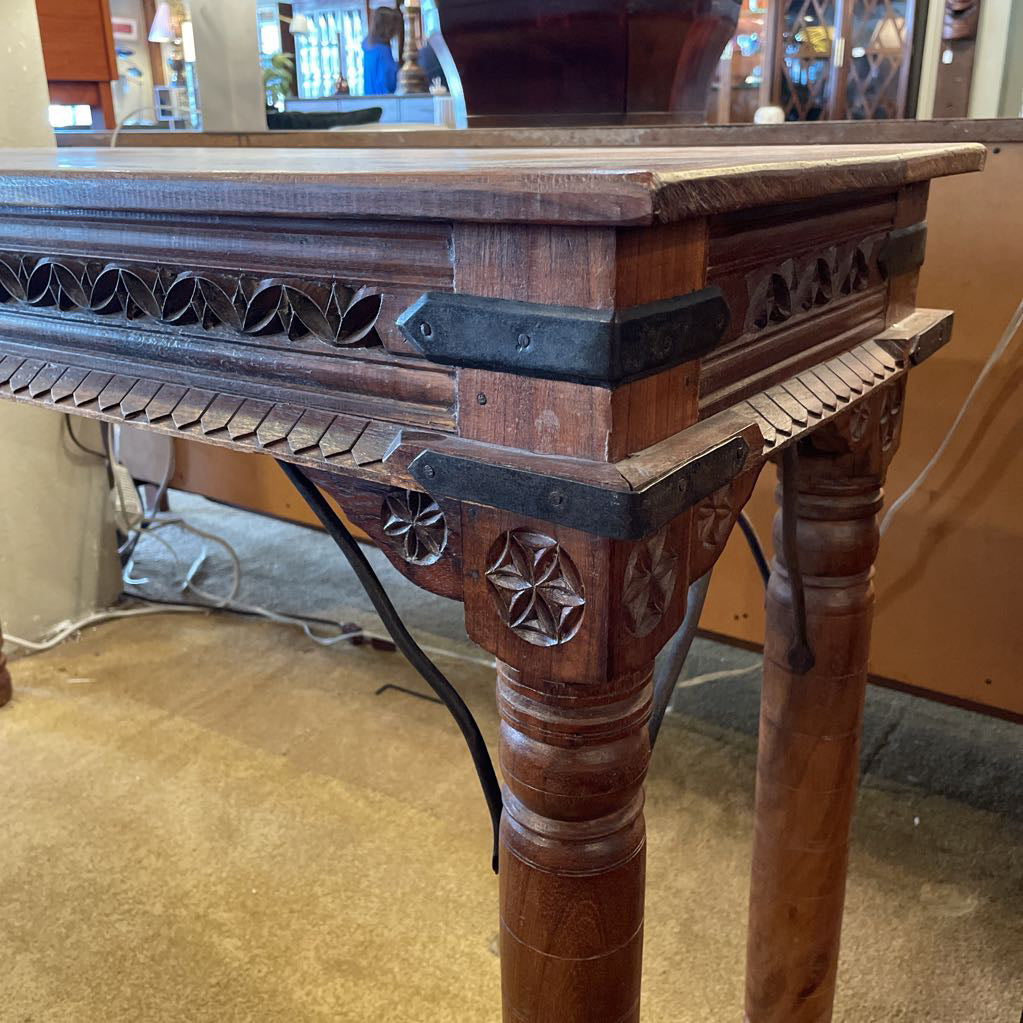 This Solid Wood Carved Trim Console Table is a beautiful marriage of traditional craftsmanship and understated elegance. Featuring a warm, honey-toned finish, the table is defined by its intricate hand-carved apron, edge, and elegant legs. This piece is reinforced with dark metal hardware ensuring it will last for many years.