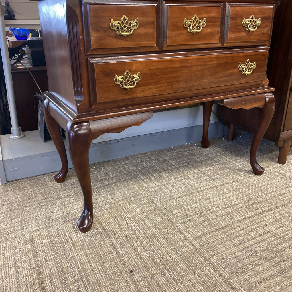 This Traditional Highboy Dresser is a stately piece of furniture that brings classic elegance and ample storage to any bedroom. Finished in a rich, dark mahogany tone, the dresser features a two-piece stacked design with a total of eleven drawers in varying sizes. The top section is distinguished by a dramatic broken-pediment bonnet top with a central carved finial, while the base is supported by elegant cabriole legs ending in pad feet.
