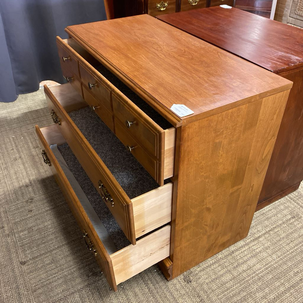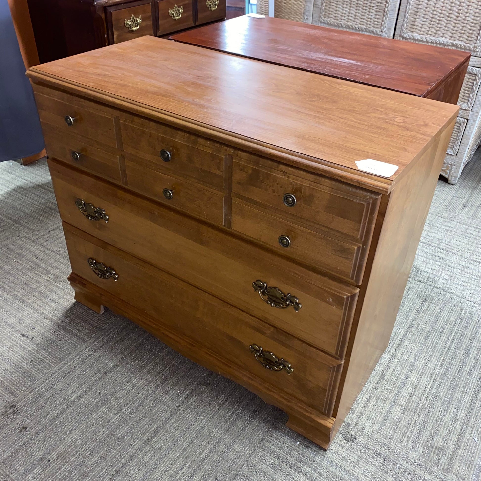 This practical storage piece is finished in a warm, medium-honey oak tone that beautifully highlights the timber's natural grain and subtle textures. Its classic, rectangular silhouette features a slightly overhanging top and a decorative bracket-style base, offering a sense of permanence and traditional charm. Each drawer is accented with classic brass-toned hardware, including simple round knobs on the top tier and elegant ornate swing bails on the bottom.