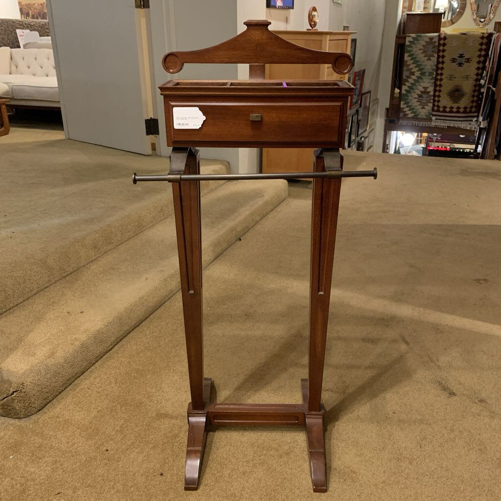 The Wood 1 Drawer with Hanger Bar Suit Hanger is an essential valet for the modern gentleman, combining traditional craftsmanship with organized utility. Crafted from rich, polished timber, this freestanding valet features a contoured suit hanger and a specialized trousers bar to maintain the pristine silhouette of formal attire. The integrated center drawer and divided top tray offer dedicated storage for cufflinks, timepieces, and daily accessories, while the sturdy pedestal base ensures stability. This elegant piece serves as a sophisticated and functional anchor for a primary bedroom suite, a walk-in dressing room, or an executive guest room.
